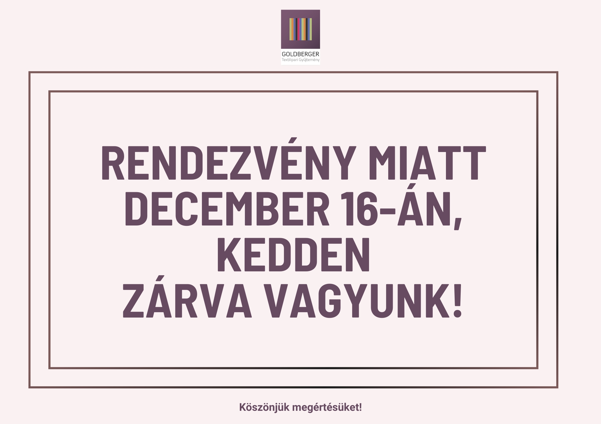 December 16-án, kedden rendezvény miatt zárva vagyunk. December 17-e szerdától újra várjuk kedves látogatóinkat 10-től 18 óráig, advent utolsó szombatján meghosszabbított nyitvatartással, 19 óráig.