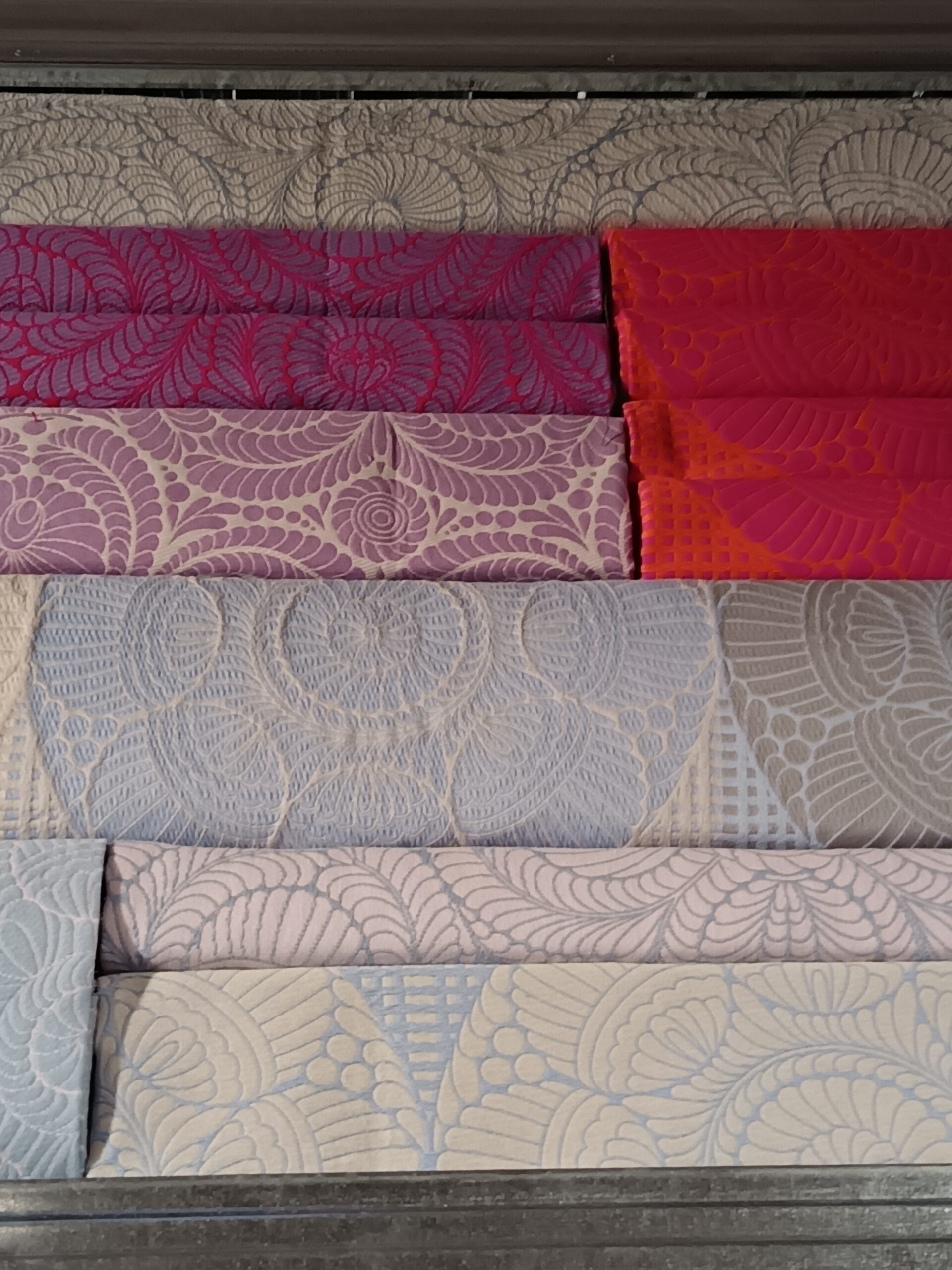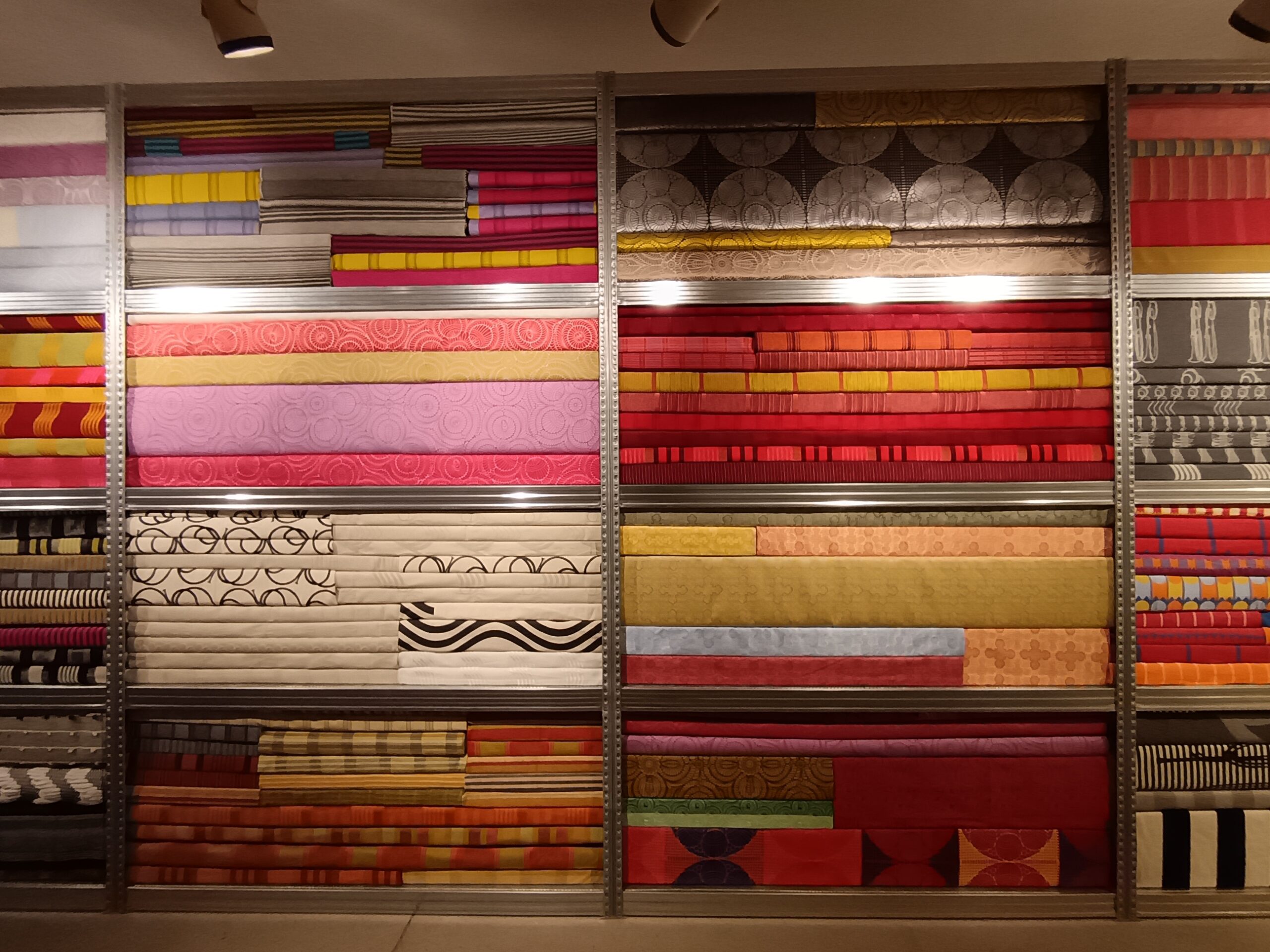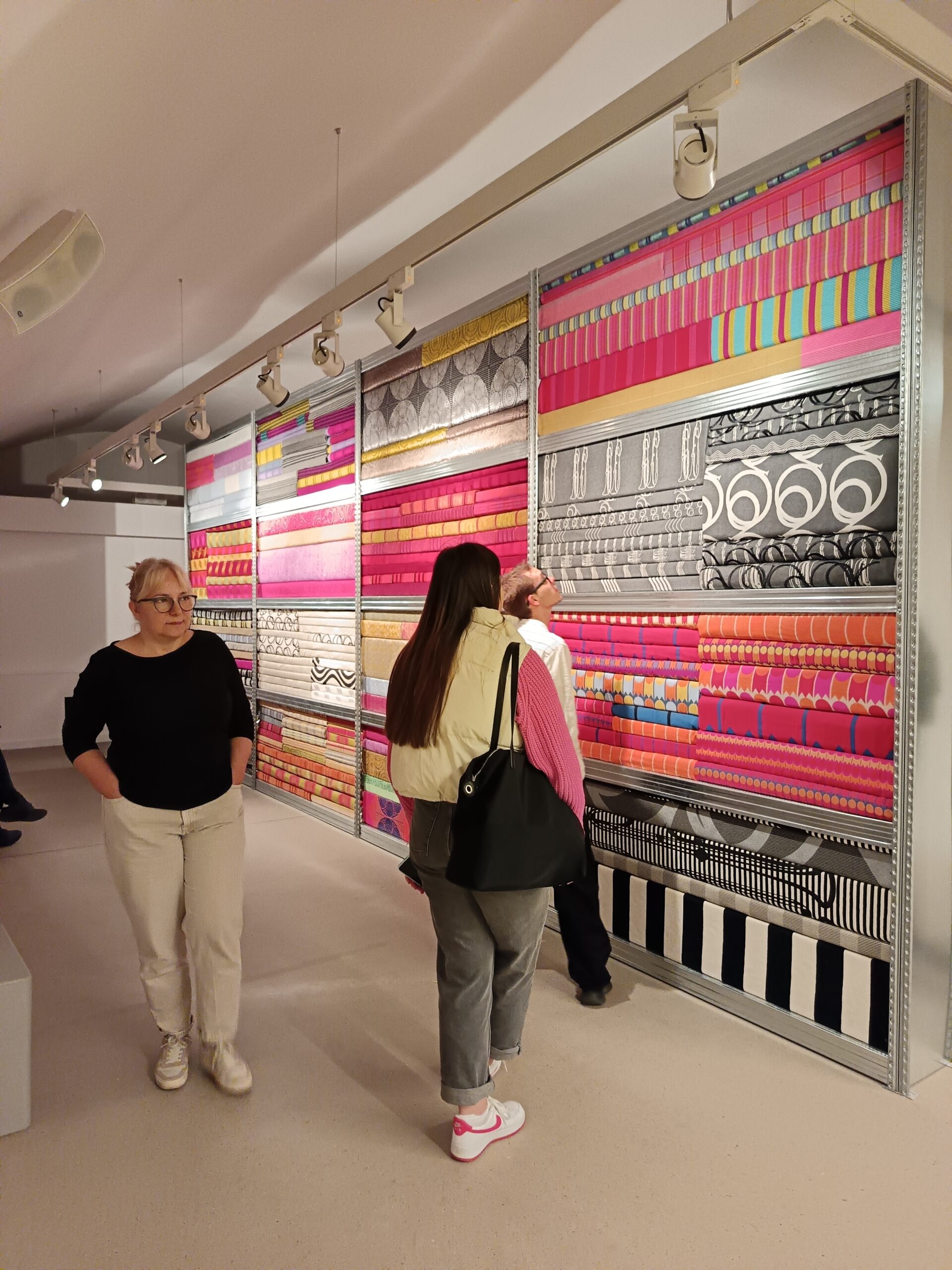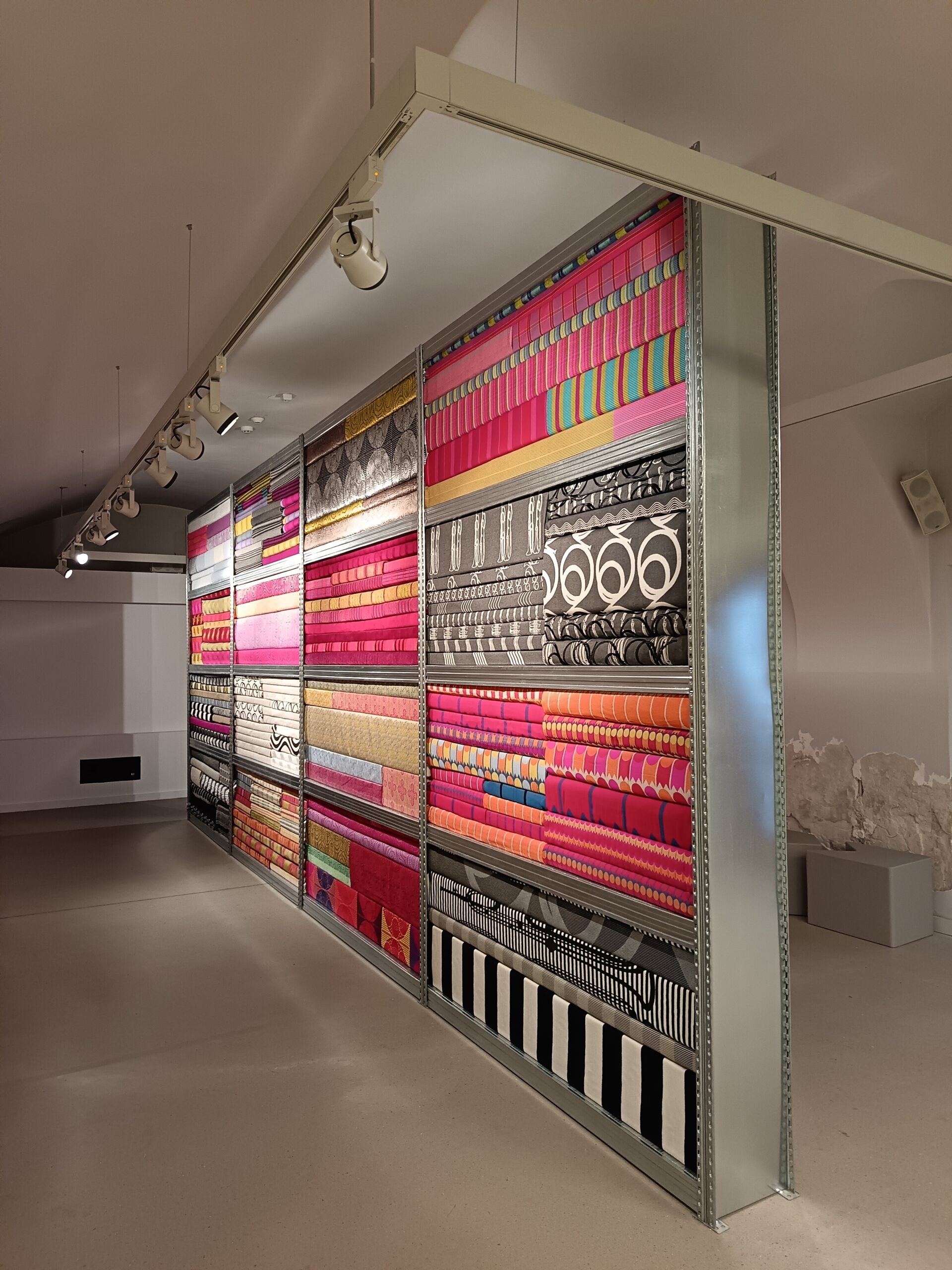 A kiállítás központi eleme egy monumentális, falszerű polcrendszer, amelyen egymásra hajtogatva, rétegezve sorakoznak a textilek – egyfajta anyagarchívumként. Ez a stóc nemcsak látványos installáció, hanem időbeli lenyomat is: minden egyes réteg az elmúlt 25 év egy-egy egyedi tervezésű textil kézzel fogható részletét hordozza. A néző valóban megérintheti a tárgyiasult időt – az anyag minőségét, struktúráját, színét, a gyártás és a használat kontextusát.